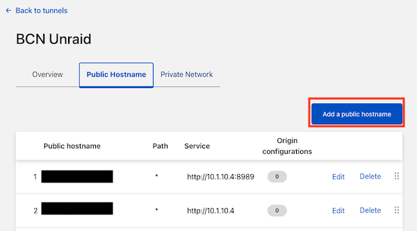 - In your Tunnel section click on Public Hostname and add a new hostname by clicking on Add a public hostname.