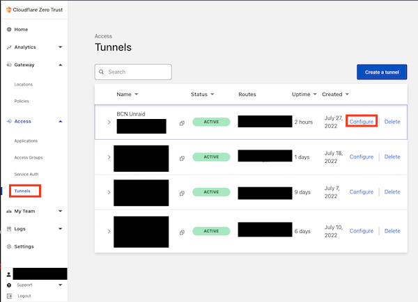 - Click Tunnels and then configure next to the Cloudflare Tunnel you would like to use.