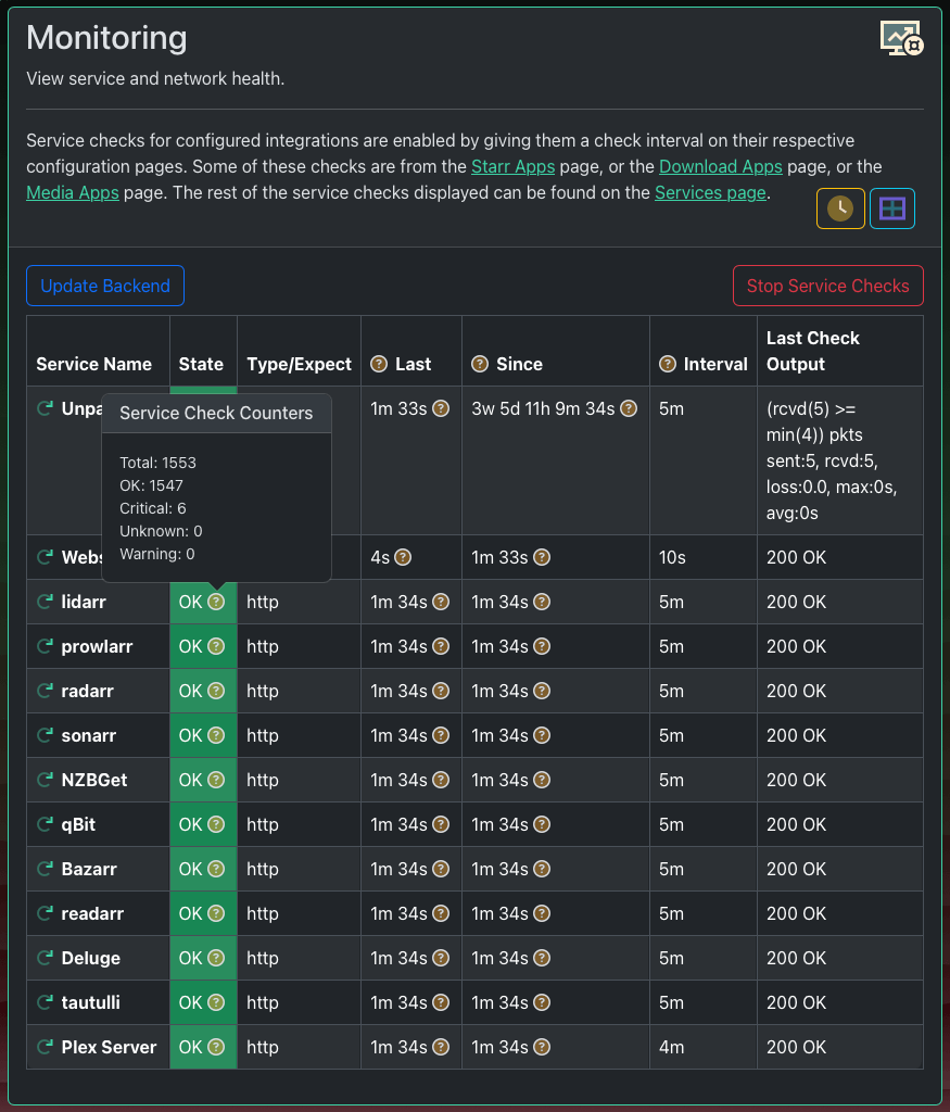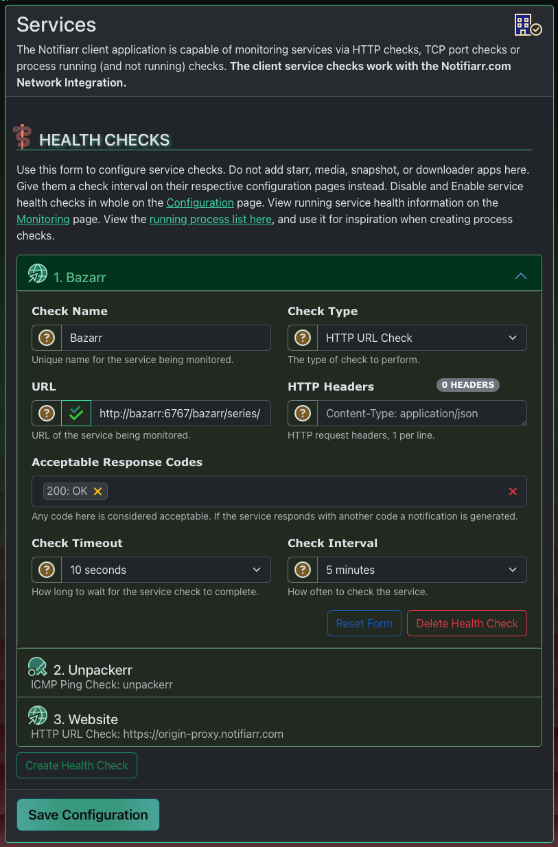 The application will automatically add service checks for any instances you configure. An instance is just an application like Radarr or Transmission. When you add the instance, all you need to do is choose a Check Interval duration. That determines how often the client checks the instance's health.